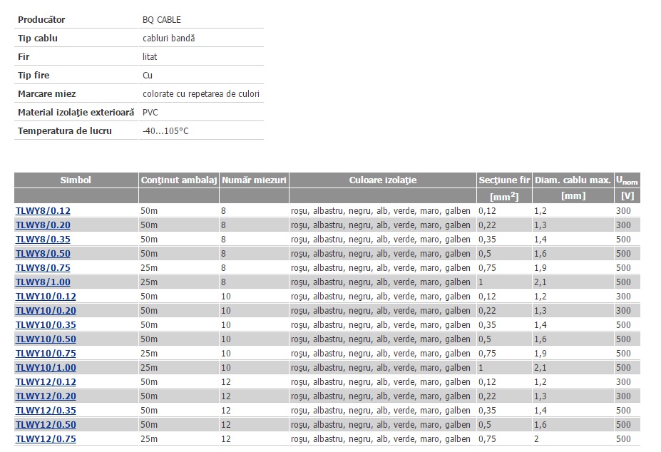 Cablu banda, 10 fire, 0.12mm2, Cu, 300V, TLWY10/0.12