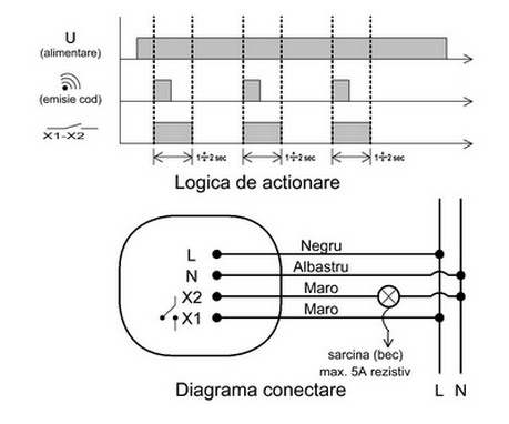 - dupa receptia unui cod valid de buton/emitator contactul X1-X2 se inchide (cupleaza) timp de 1..2 sec, dupa care se decupleaza din nou. Pentru repetarea fenomenului se impune o noua apasare a butonului telecomenzii !