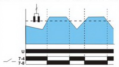 In conditii uscate, contactul releului ramane in pozitia 7-4. Odata ce senzorul este cufundat in lichid, LED-urile indicator de culoare rosie se aprind, si de contactul este mutat in pozitia 7-8. Dupa ce nivelul de lichid conductiv scade (si electrozii senzorului de lichid se usuca), revine contactul in pozitia 7-4.